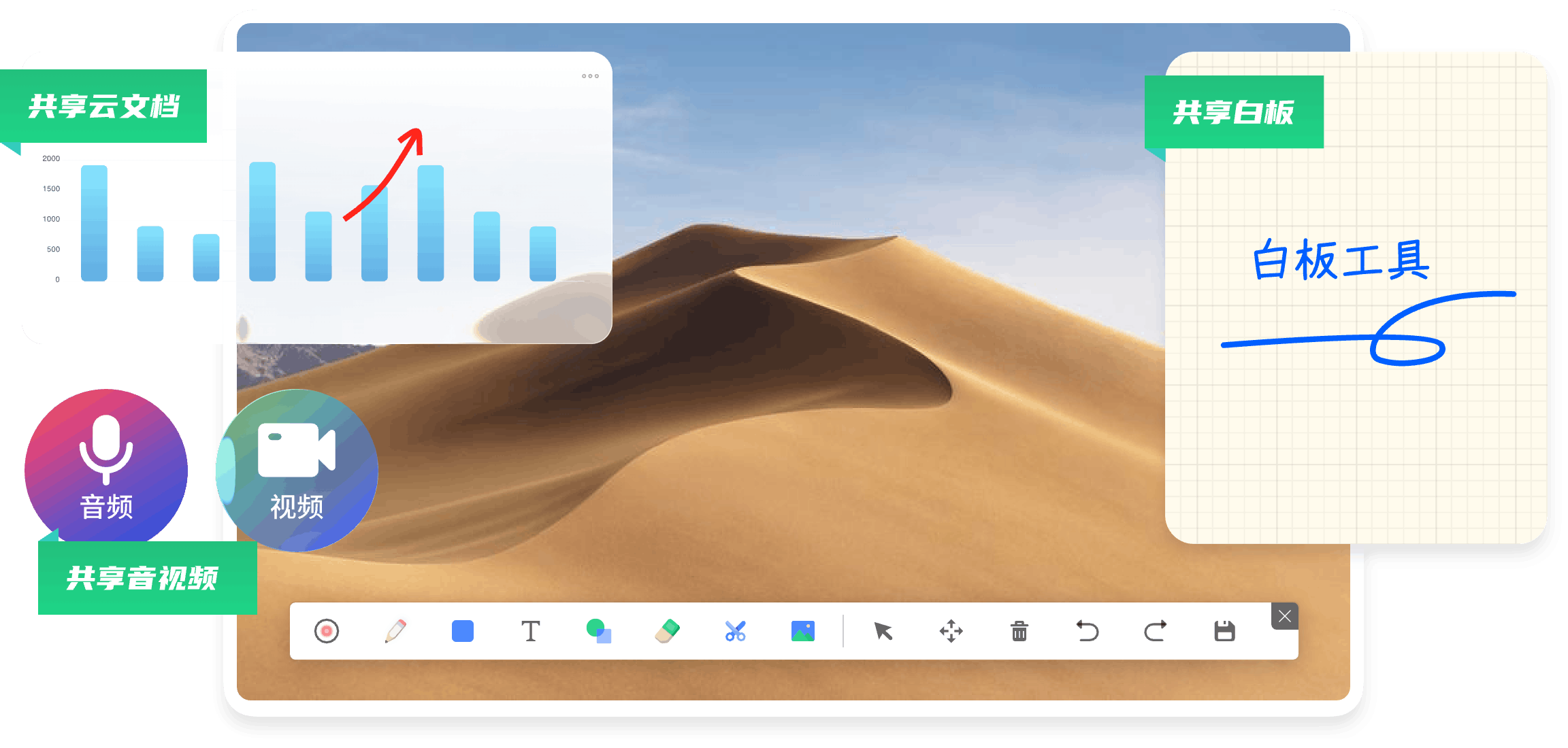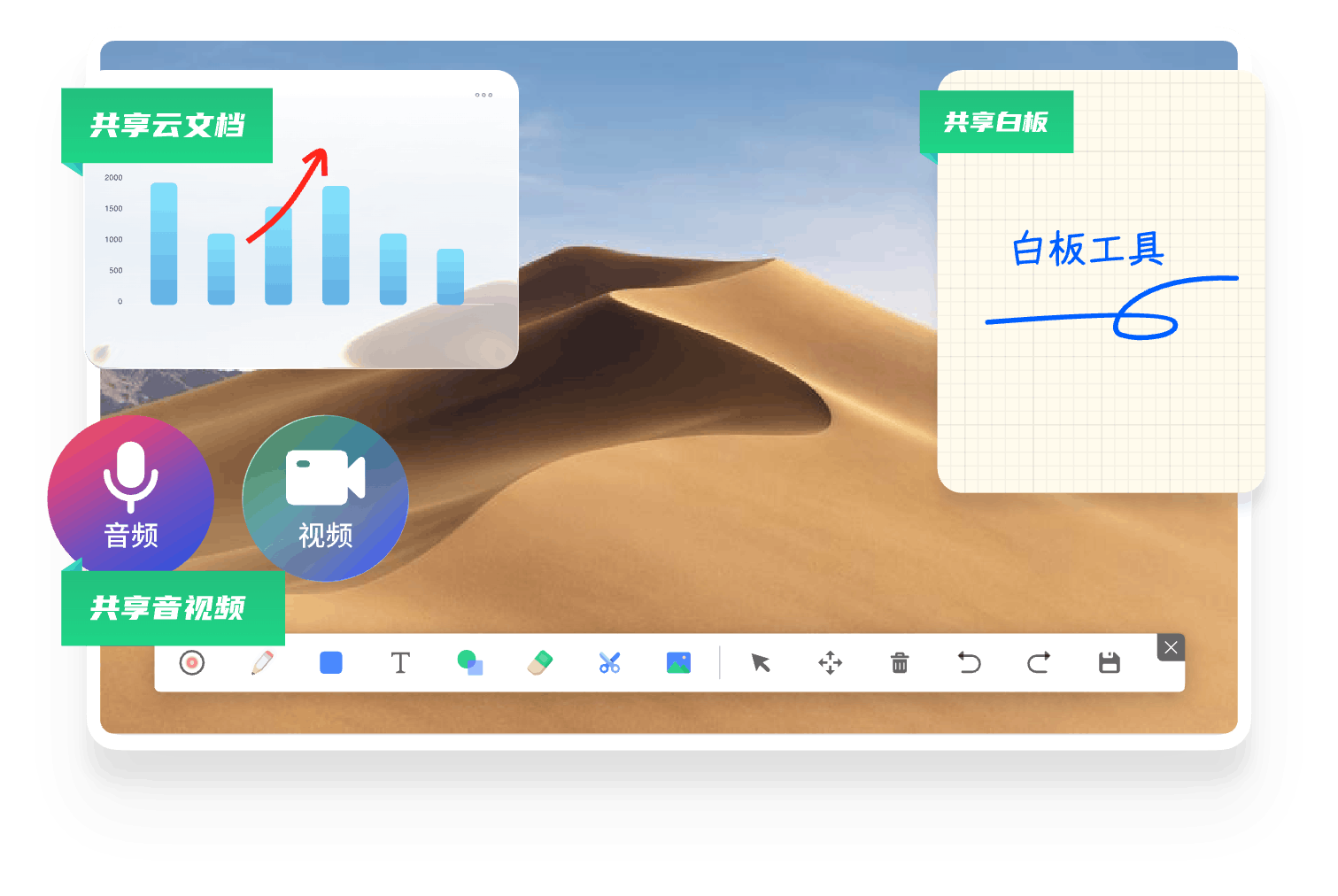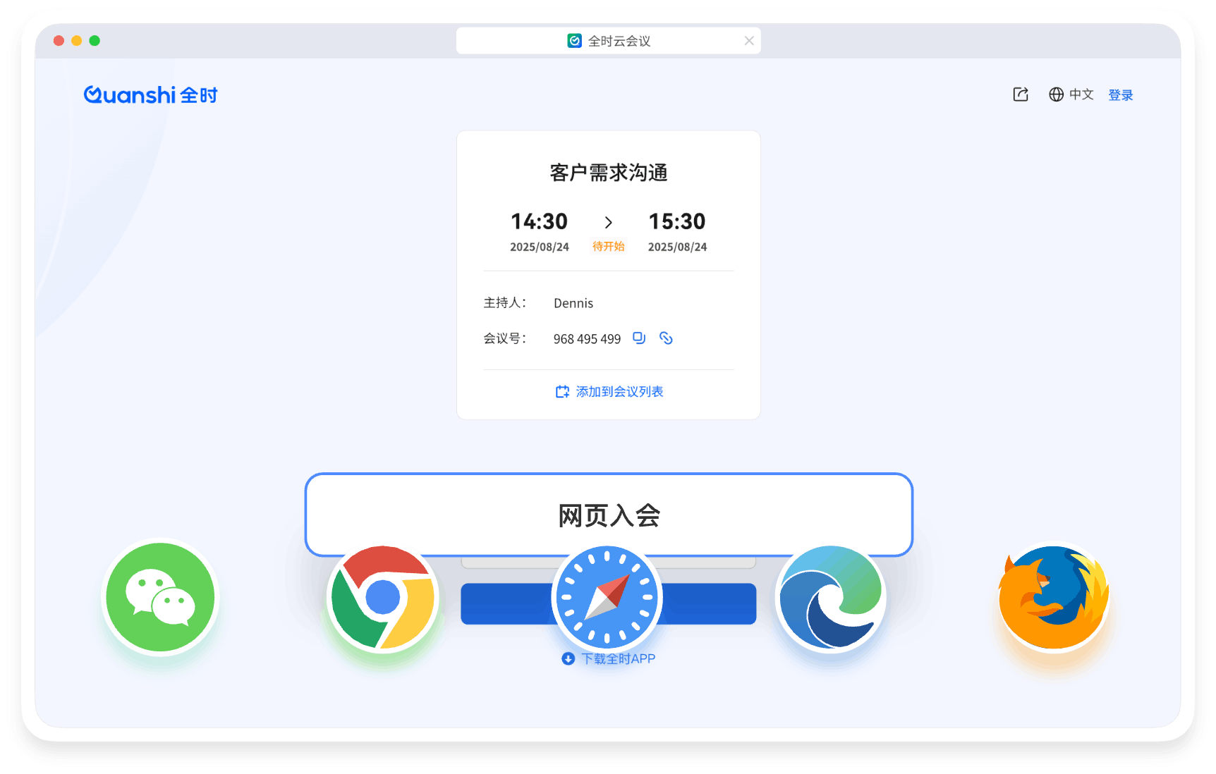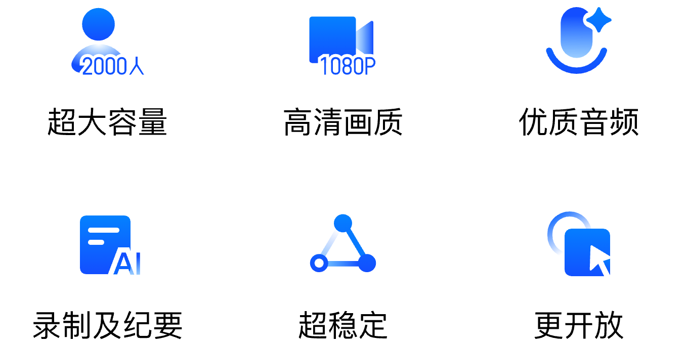 全时云会议的优势 免下载免安装网页入会 无需下载客户端,网页加入会议,支持微信浏览器、Chrome、Safari、Edge、Firefox 音视频共享更顺畅 视频更清晰、流畅 自研SVC,可根据机器情况、网络情况和观看者屏幕分辨率动态调整编码层数、分辨率兼顾清晰度、流畅度和带宽占用。 音频原声无损伤 自研AI降噪算法超强,智能精准识别消除超百种背景噪声;AI回声消除算法也优,1024ms内回声全消,抑啸叫且护原声。 更多共享方式 电脑支持多种共享:桌面自定义区域/白板/本地音视频共享手机支持屏幕共享、支持远程控制。 不限参会终端 兼容 Windows、iOS、安卓、鸿蒙系统,电脑和手机都适用 不限录制及纪要 会议实时录制,通过AI智能总结生成纪要,根据主题、参会者、章节分类 共享一切 手机共享桌面、白板、云文档及音视频,可协作批注,保存及分享 300家全球500强企业都在用 843 次浏览