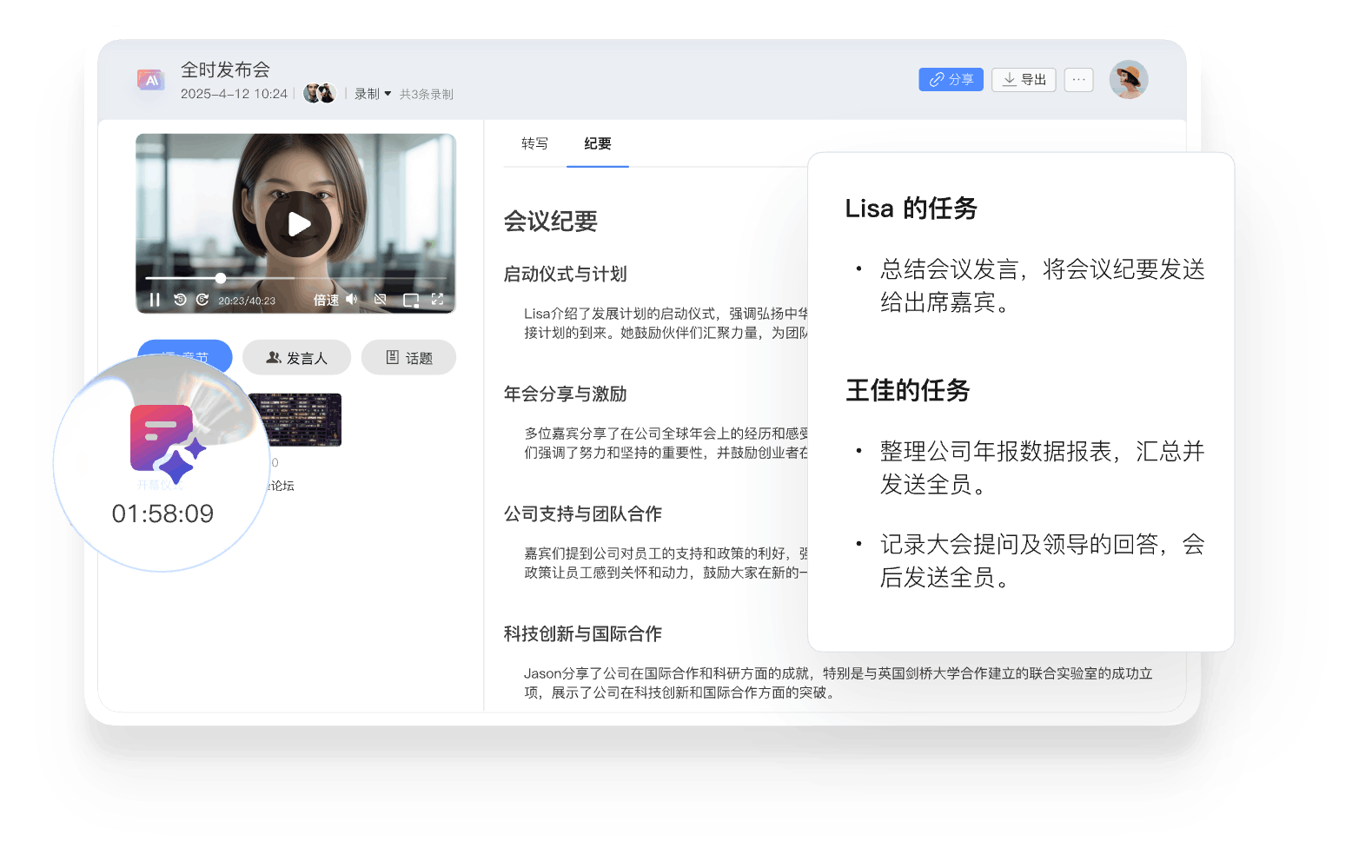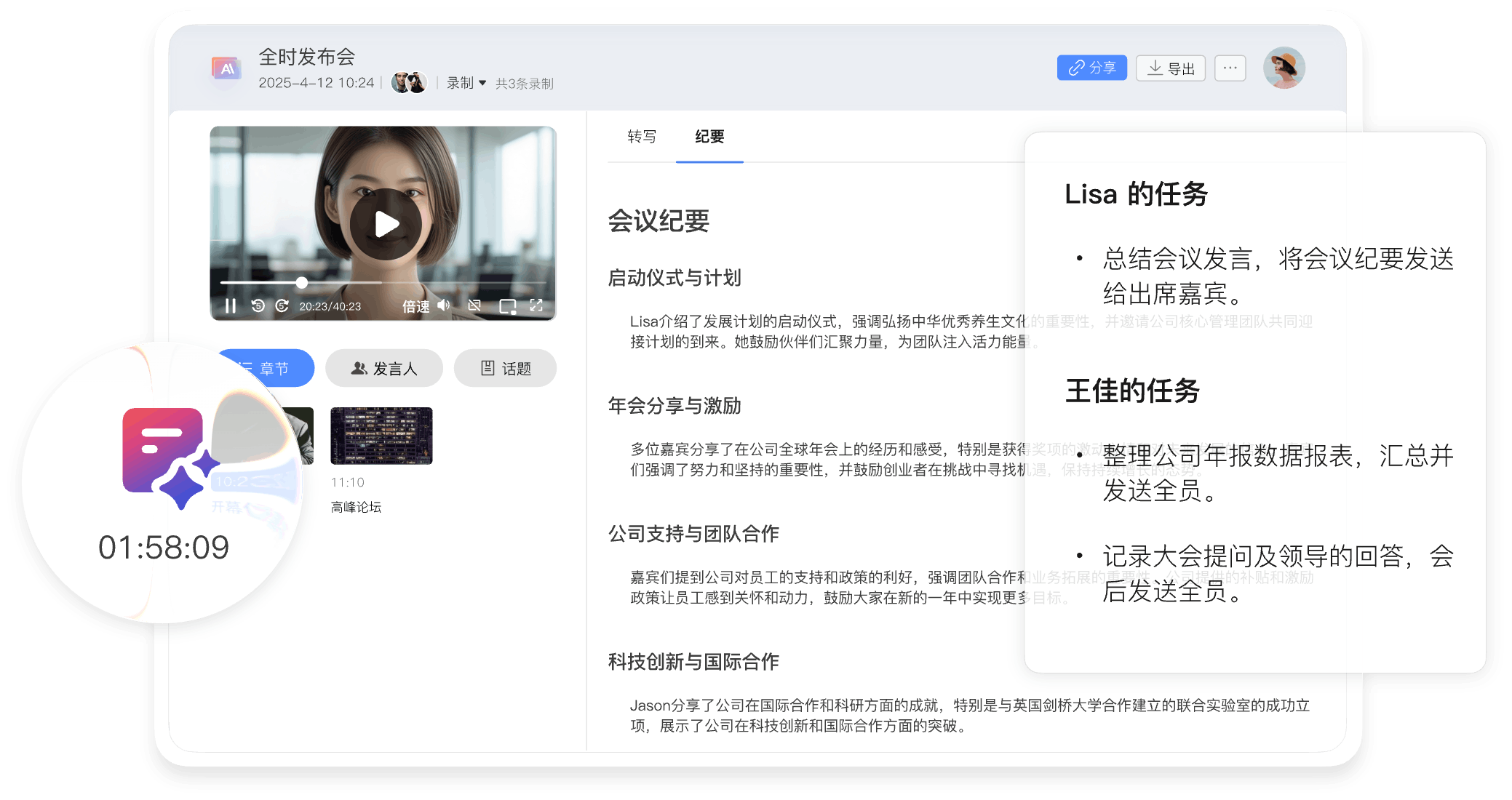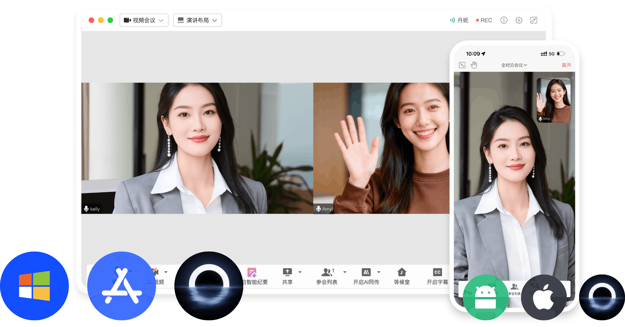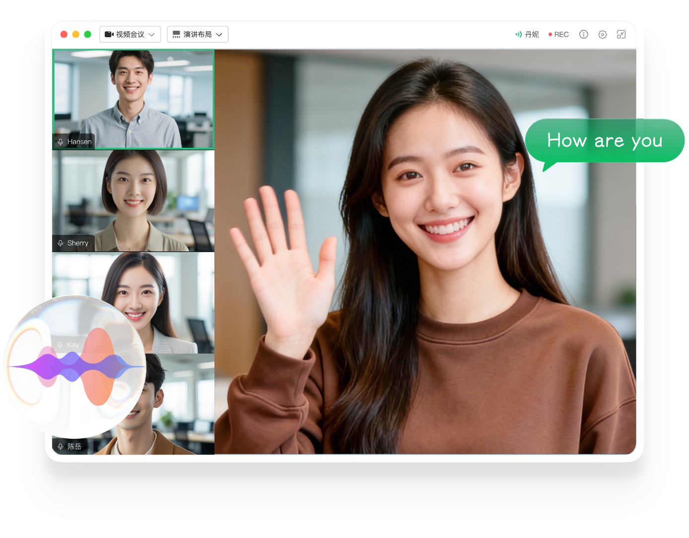 全时云会议的优势 免下载免安装网页入会 无需下载客户端,网页加入会议,支持微信浏览器、Chrome、Safari、Edge、Firefox 音视频共享更顺畅 视频更清晰、流畅 自研SVC,可根据机器情况、网络情况和观看者屏幕分辨率动态调整编码层数、分辨率兼顾清晰度、流畅度和带宽占用。 音频原声无损伤 自研AI降噪算法超强,智能精准识别消除超百种背景噪声;AI回声消除算法也优,1024ms内回声全消,抑啸叫且护原声。 更多共享方式 电脑支持多种共享:桌面自定义区域/白板/本地音视频共享手机支持屏幕共享、支持远程控制。 不限参会终端 兼容 Windows、iOS、安卓、鸿蒙系统,电脑和手机都适用 不限录制及纪要 会议实时录制,通过AI智能总结生成纪要,根据主题、参会者、章节分类 共享一切 手机共享桌面、白板、云文档及音视频,可协作批注,保存及分享 300家全球500强企业都在用 843 次浏览